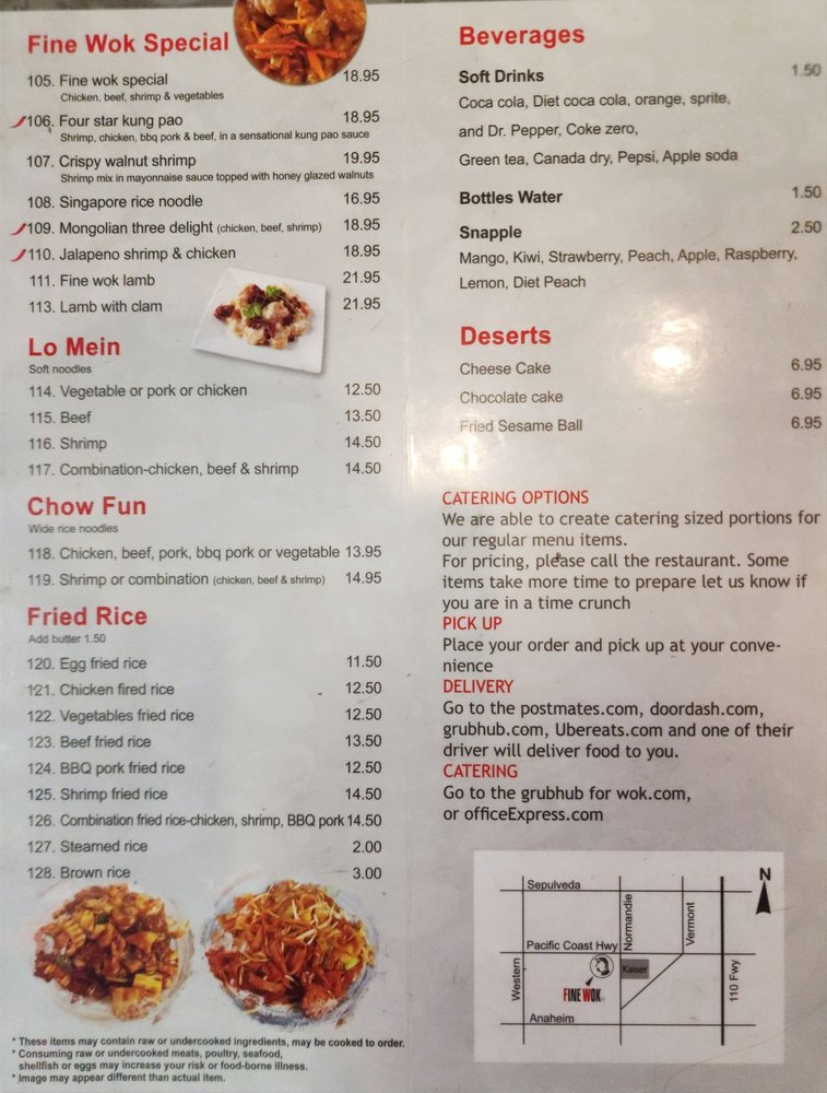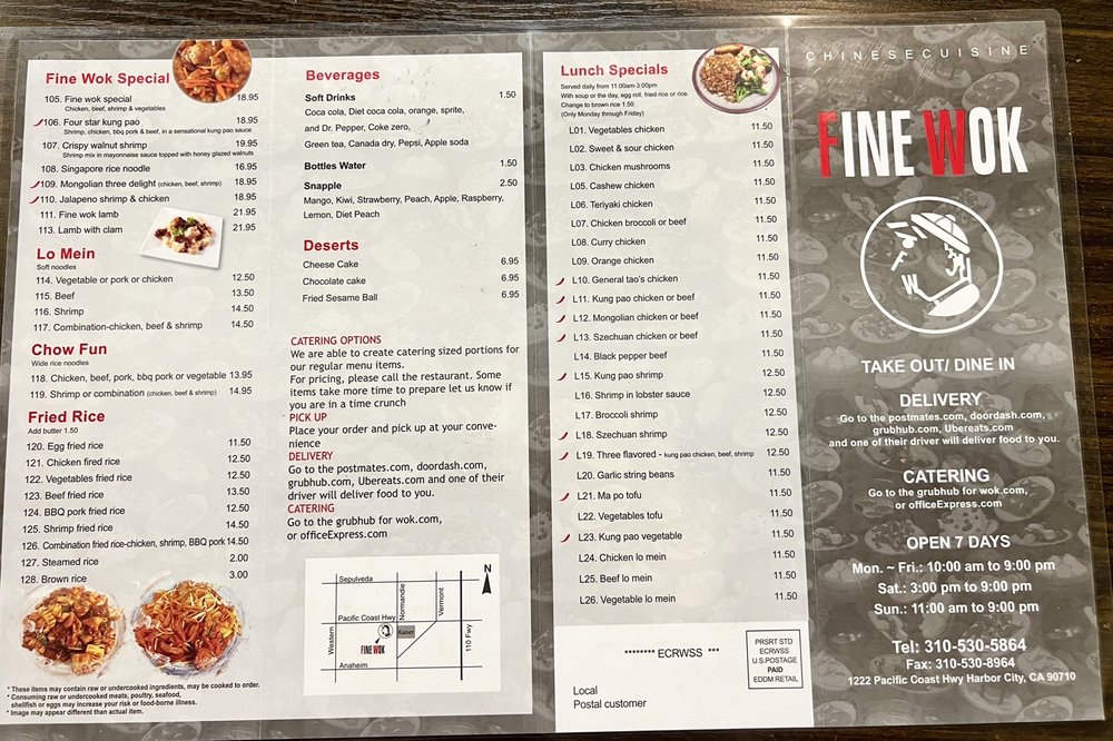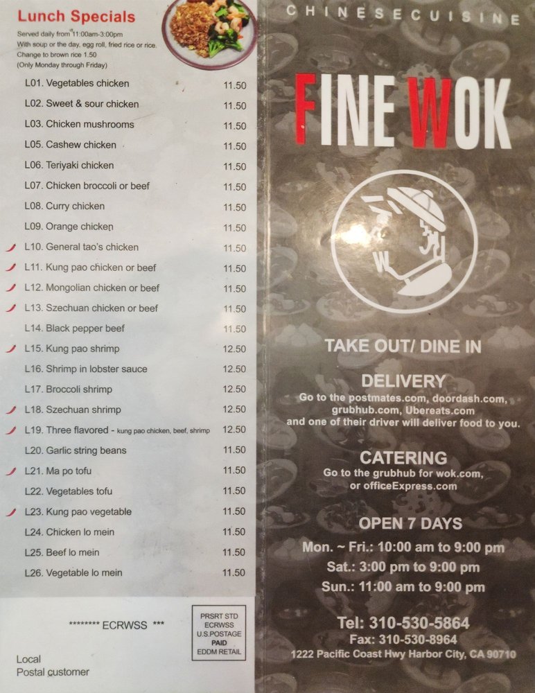 Fine Wok is a Chinese restaurant located in Harbor City, CA, offering a variety of appetizers, soups, and noodle dishes. The menu includes options like Cheese Wontons, Egg Roll, Hot and Sour Soup, and Chicken Vegetable Noodle Soup. Customers praise the fresh dim sum and authentic Chinese flavors. The owner, who is also the chef, ensures that every dish is prepared with care and love. Reviewers enjoy the friendly service and quick delivery options. The dishes are flavorful, satisfying cravings for dishes like Szechuan Eggplant and Mongolian Beef. Fine Wok provides a pleasant dining experience with a wide range of options for different preferences. Happy Hour and alcohol are also available for those looking to unwind after a long day.